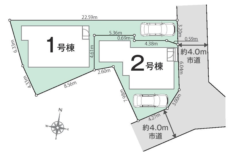 | 接道状況 | 接道: 東 公道 道路幅: 4m 接道: 南 公道 道路幅: 4m |