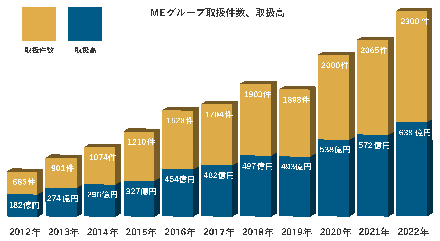 上記のグラフはエムイーPLUS町田が属するME Groupの取扱件数と取扱高を表しています。ME Groupでは、2003年の創立当初から15,000件以上のお取引をお手伝いさせて頂きました。2022年には過去最高の取扱件数2,300件、取扱高638億円を達成しております。