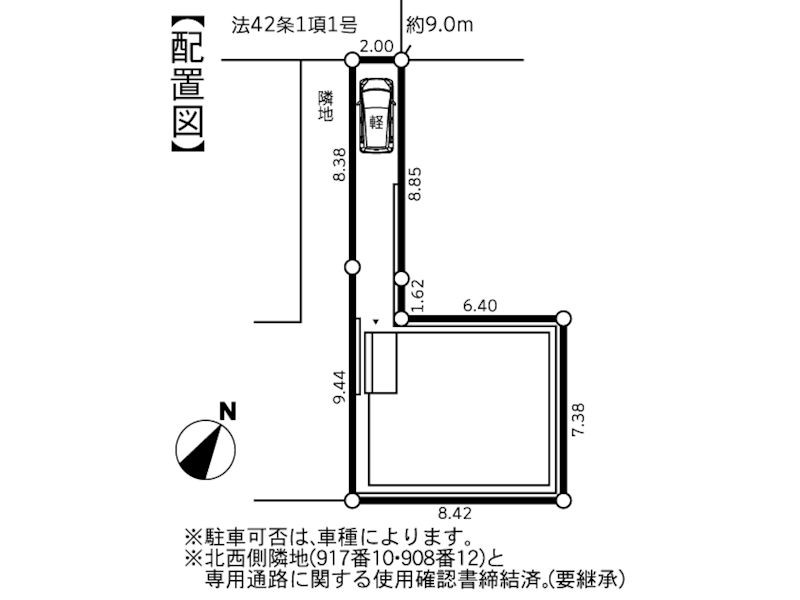 | セットバック | なし | 法令上の制限 | 準防火地域 第1種高度地区 高さ10m 敷地面積100平米以上 宅地造成および特定盛土等規制法 北西側隣地(917番10、908番12)と専用通路に関する使用確認書締結済(要継承) |